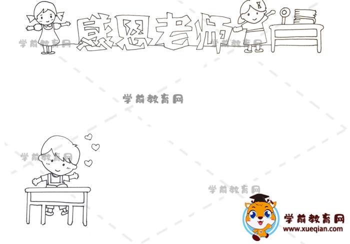 1、首先在手抄报画面顶部中间写出“感恩老师”的标题文字,并在手抄报画面顶部左上角和右上角画出人物和书本等图案。