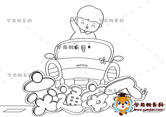 5、小汽车是红色、黄色和蓝色的,男孩是棕色和青色的,彩虹和花朵涂上多种颜色,标志是红色的。