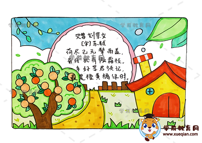 《赠刘景文》是北宋文学家苏轼的作品。这首诗是作者送给好友刘景文的一首勉励诗。整首诗抒发了作者的广阔胸襟和对同处窘境中友人的劝勉和支持,托物言志,意境高远。有小伙伴学完这首诗后,想画关于赠刘景文诗配画,下面就给大家分享一个精美的教程哦!