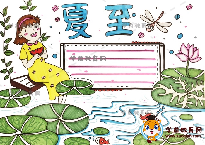 同学们想要画一幅关于二十四节气之一夏至主题的手抄报吗,可以尝试在画面上画出荷叶、西瓜、小女孩、蜻蜓等图案,并涂上好看的色彩,写上有关于夏至主题的文字,简单的夏至手...
