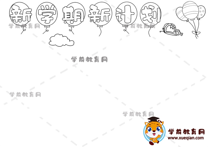 1、首先在手抄报画面的顶部写出“新学期新计划”的标题文字,再画出修饰报头文字的气球图案点缀画面,并画出报头周围点缀的云朵、气球、蝴蝶图案。